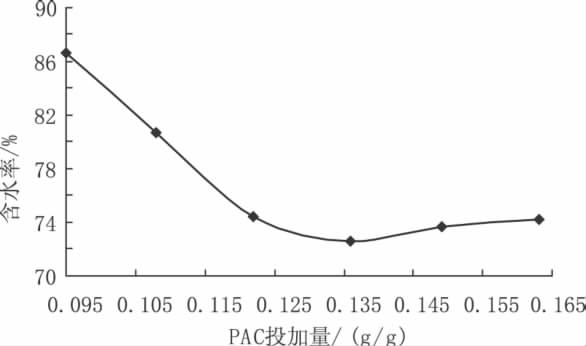 PAC 投加量對濾餅含水率的影響如圖3 所示。從圖3 可以看出,隨著PAC 投加量的增加,污泥濾餅的含水率不斷地減少較后趨向于穩(wěn)定。當投加量為0. 136 g /g 時達到較低值,為72. 55%,當投加量增加時,濾餅的含水率又略有上升,這可能是因為過量的PAC 使得污泥的顆粒又帶上正電荷,造成污泥顆粒間的正電荷排斥分散,使得污泥脫水困難