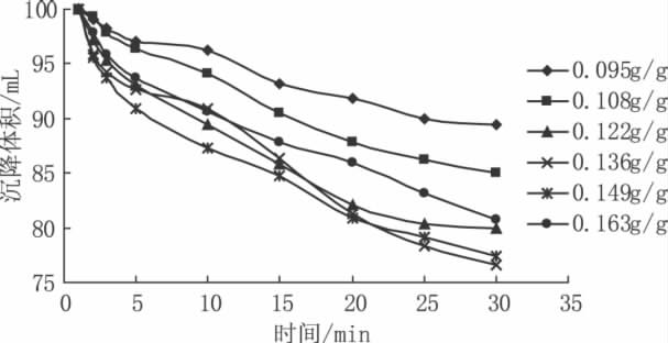 1. 2. 2 污泥沉降性能的測定量取100 mL 污泥,投入一定量的PAC,采用 1. 2. 1中的處理方法進行制備,然后倒入100 mL 量筒中,按照污泥沉降實驗方案中的規(guī)定,每隔幾分鐘 ( 由于污泥沉降的特性間隔時間逐漸延長) 記錄一次污泥體積,共計時30 min。在相同條件下,改變投加PAC 的量,得到一組數(shù)據(jù)以比較污泥的沉降性能。