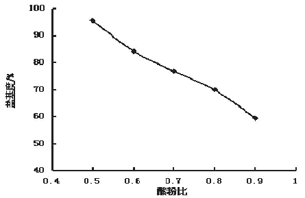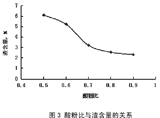 在酸液和反應溫度和時間不變的情況下改變酸粉比例,研究酸粉比與渣含量的關系。如圖3.